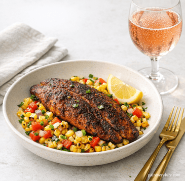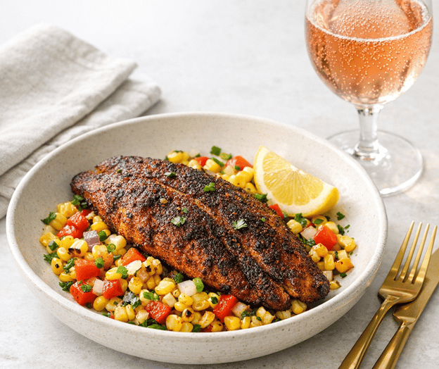 Blackened Catfish Recipe with Charred Corn Succotash and Wine Pairing